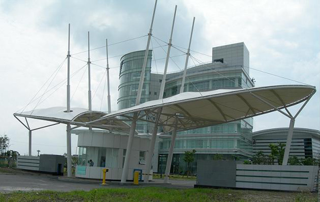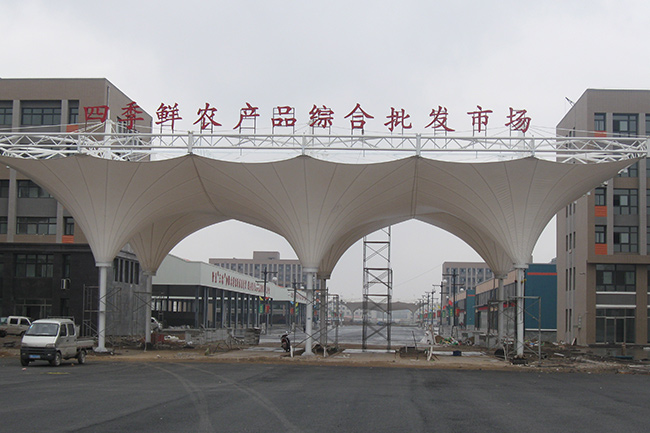 張拉膜門頭景觀的造景性,景觀張拉膜因其獨特的曲面外形富含豐富的造景特性,膜面通過張力達到自平衡。負高斯膜面高低起伏具有的平衡感使體型較大的結構看上去像擺脫了重力的束縛般輕盈地,雕塑般的質感令人激動。