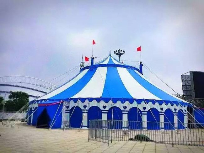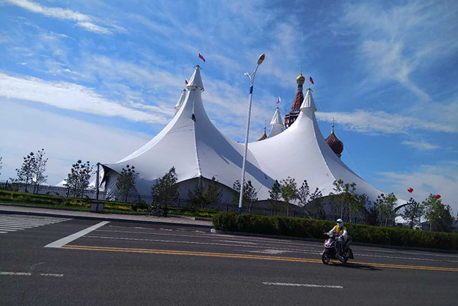 6、耐候性:膜結構馬戲大棚表面有防紫外線的共擠層,可防止太陽紫外線引起的樹脂疲勞變黃。表面共擠層具有化學吸收紫外線并轉化為可見光。對植物光合作用有良好的穩定效果(極適合保護各類車、貴重藝術品及展品,使其不受紫外線破壞)